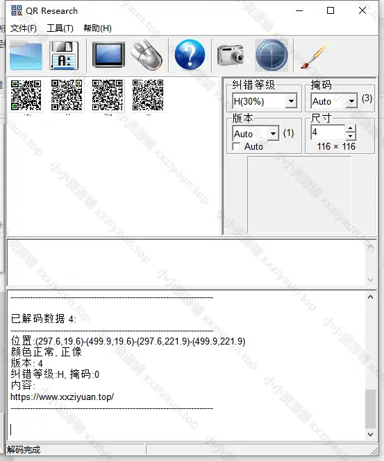 软件介绍:QR Research 是一款本地二维码识别,文本生成二维码工具,支持识别单个二维码,也支持识别一张图片内的四个二维码。还可以进行二维码的简单美化。(测试系统win10 64)