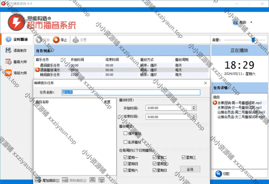 超市播音系统是由南京大学人工智能国家重点实验室下属的纯研发的信息与软件产品开发组织思维构造推出的一款超市播音系统应用,只需把播音稿导入到软件,这款语音播报软件就可根据您设定的时间进行定时语音播报,专为商场、超市等营业场所而设计。