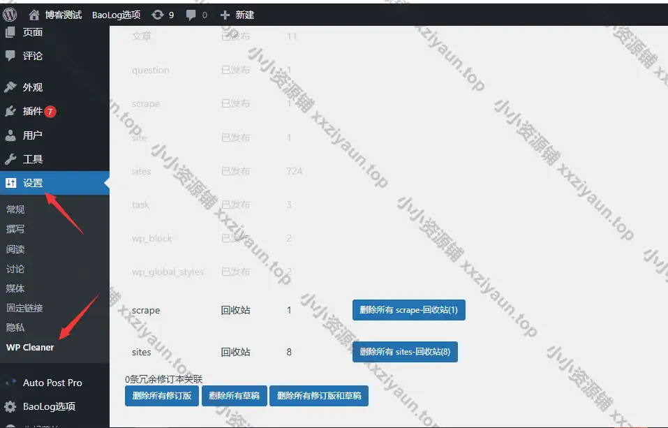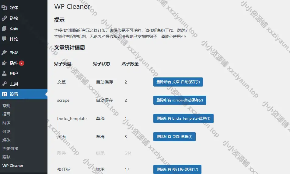 启用后,点击“设置”→“WP Cleaner”