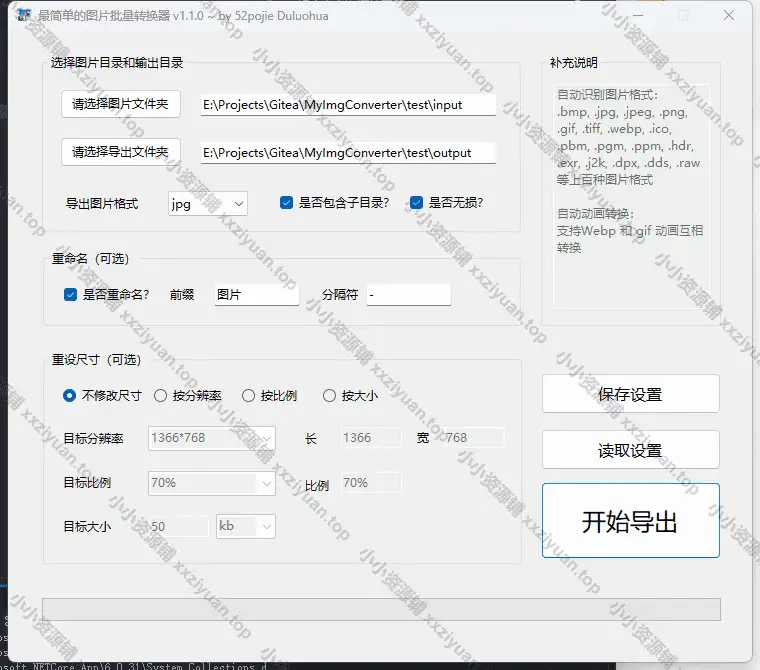 一个简单易用的图片批量转换工具,支持非常多的图片格式。可以查看下图支持的格式。可自由选择输出格式,尺寸大小以及批量重命名。
