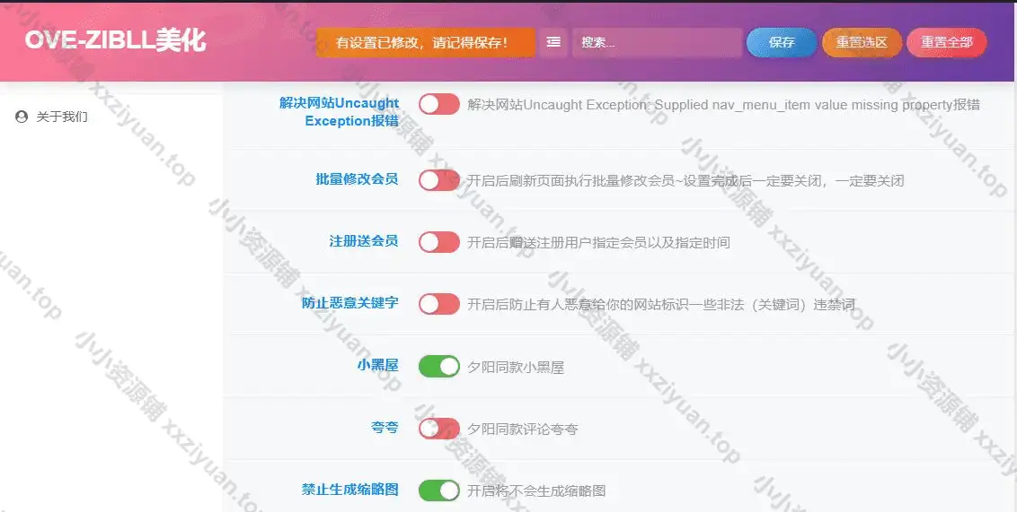 一款适用于WordPress子比主题的多功能美化插件,能够美化的设置非常多。五大板块:基础&美化,高级%设置,seo优化,小工具。更多美化插件可以在本站搜索: 子比美化