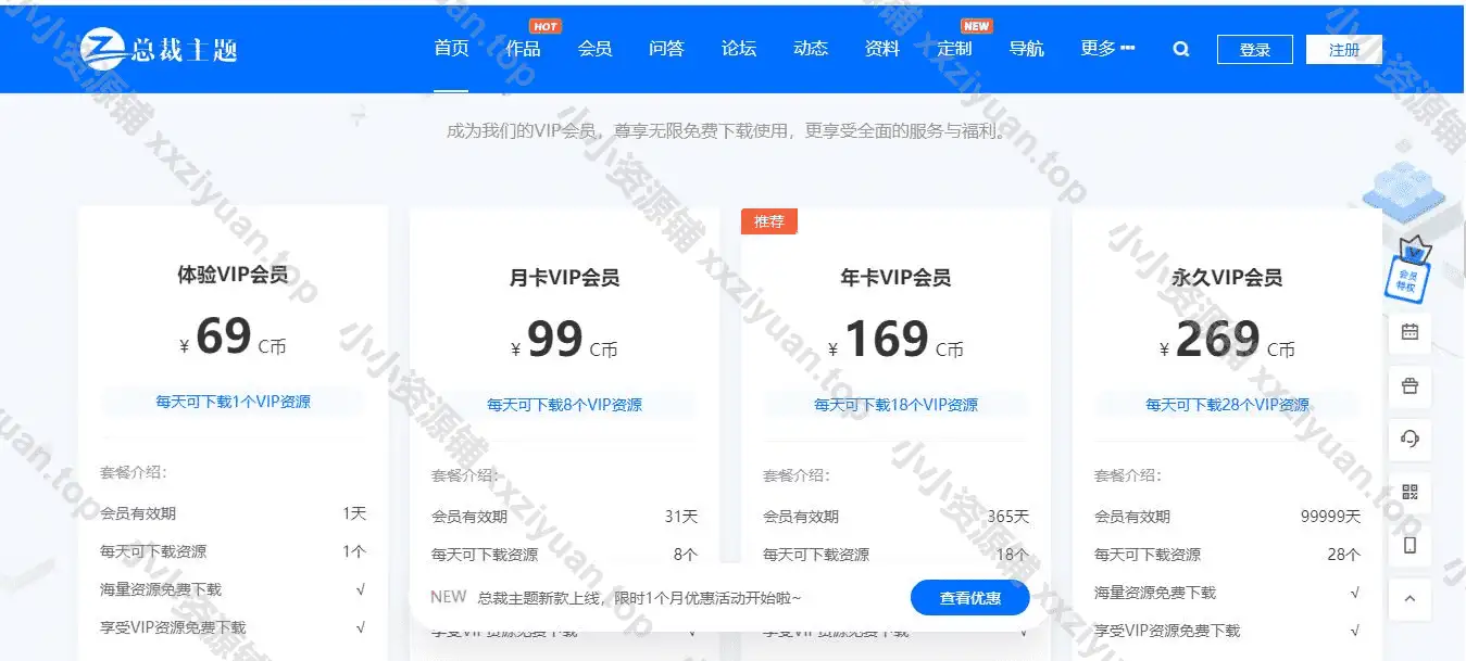 支持一切素材虚拟资源付费下载、以及付费/免费/VIP模式等线上运营体系,搭配主题高颜值办公素材专类满足所有素材下载业务需求。