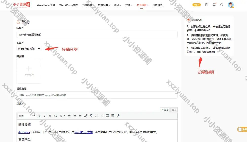 WordPress后台-页面-新建页面-命名投稿-模板选择投稿页面-正文输入投稿注意事项-发布