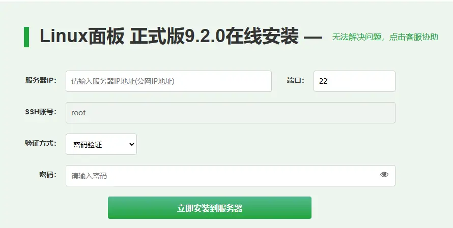 往下拖一点,进入Linux面板在线安装。分别输入刚刚获取的ip地址及秘钥。点击安装即可。