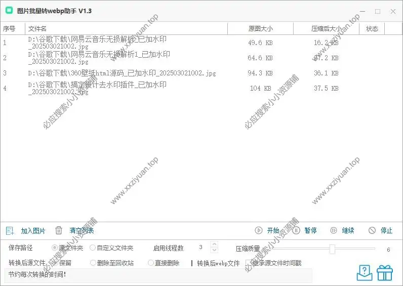 图片批量转webp助手一个本地图片转换工具,支持常见图片格式批量转换为webp格式。可自定义压缩质量等级、保存路径、线程数、是否删除源文件等等。窗口支持预览转换前后文件体积对比。此工具可以为网站减少图片的体积,小编刺客也正在使用。可配合简易图片加水印工具使用。