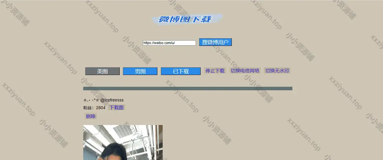 用于批量下载微博用户的图片,可自定义下载uid,也可以下载工具推荐的博主。图片会按标题自动下载并进行文件夹分类。同类型的还有微博主页图片批量下载 v2.8