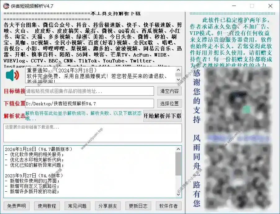 这是一款绿色便携版的短视频解析工具,无需安装,双击应用程序即可直接使用,非常的便捷,目前版本已经来到了v4.7。同类型的工具还有:res-downloader、微信视频号下载、短视频解析聚合版