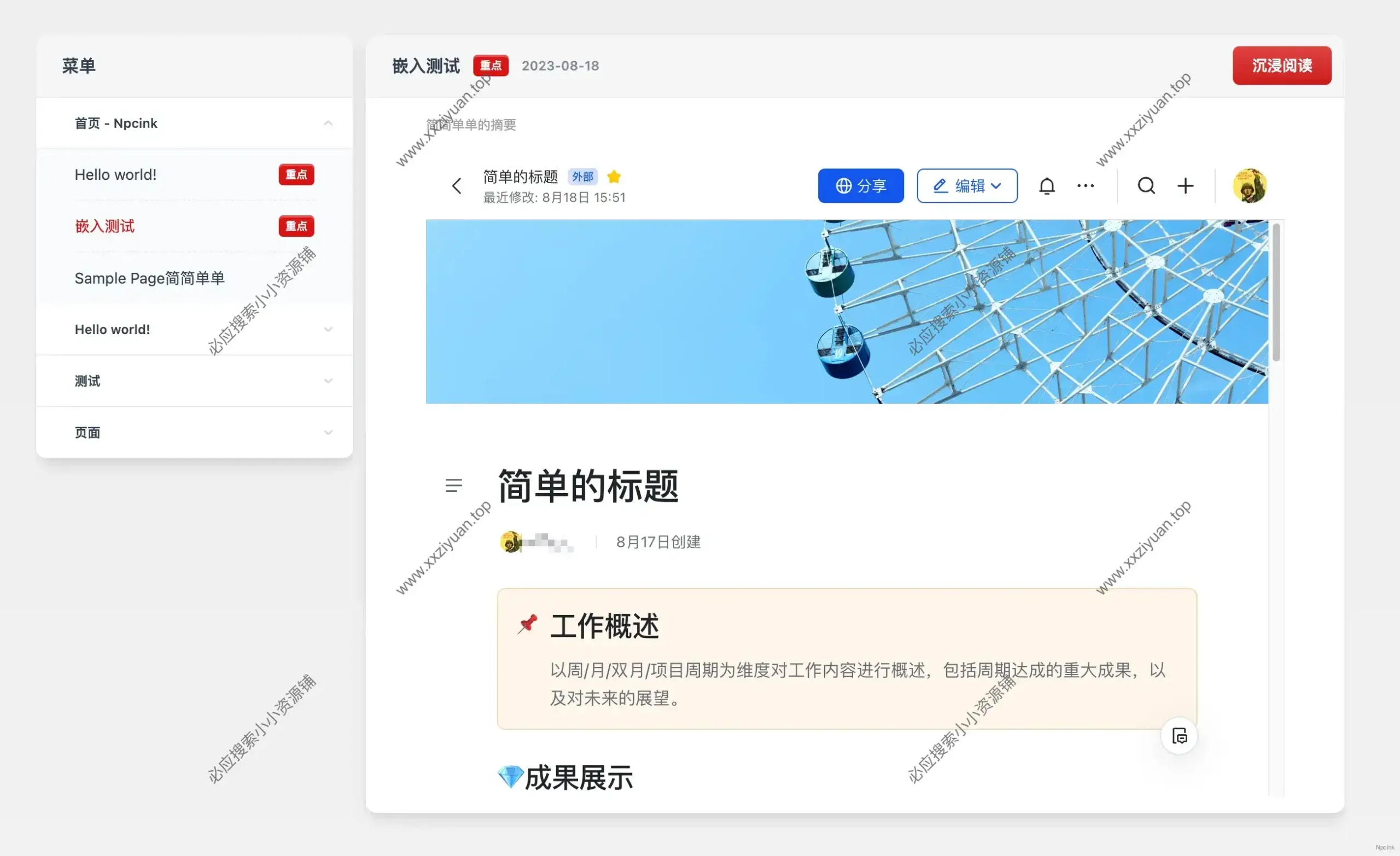 Red Line 一款简约的WordPress主题,此主题作为框架,做承载第三方页面之用,例如飞书文档等,您可以将视频图片等资源放第三方文档上,通过使用此主题做目录用。此主题使用前后端分离开发,也使用了一些技术尽量不影响正常的SEO,还望注意。