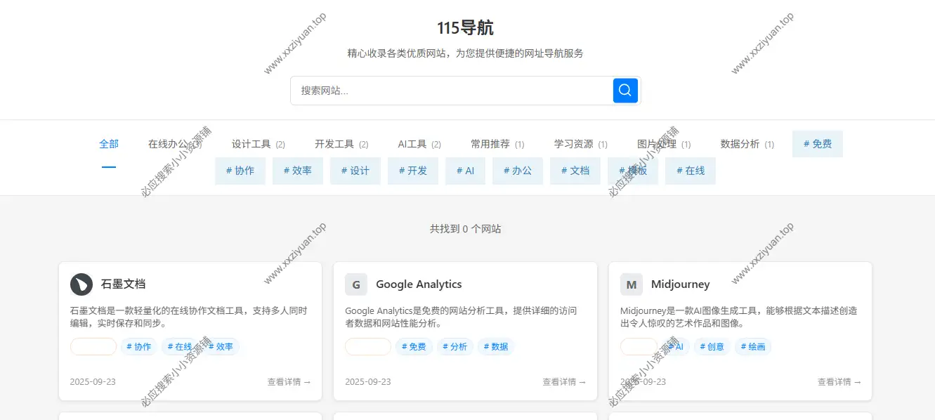 115导航是一个功能完整的网站导航WordPress主题,具有网站自动获取、标签管理、分类展示等功能。非常简单,易于使用,可导入模板。卡片式风格,自动加载。喜欢的可以下载。小站也收集了很多其他导航主题,可以在下文查看。